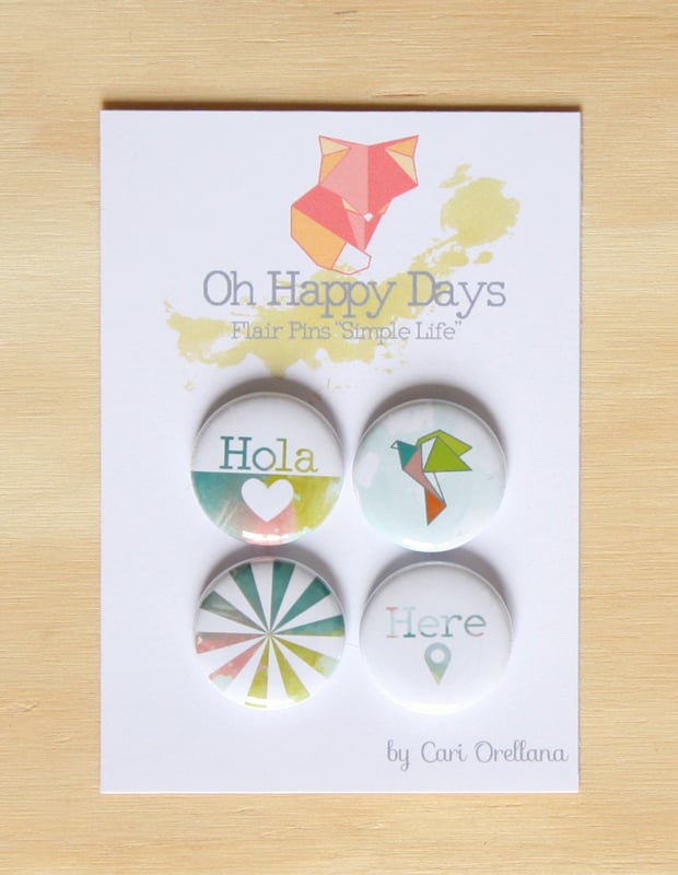 Set de chapitas "Simple Life". Cada set incluye 4 chapitas de distintos diseños de 1 pulgada cada una. Estas chapitas incluyen el pin posterior por lo que puedes usarlo para tu scrapbook o para tu ropa!